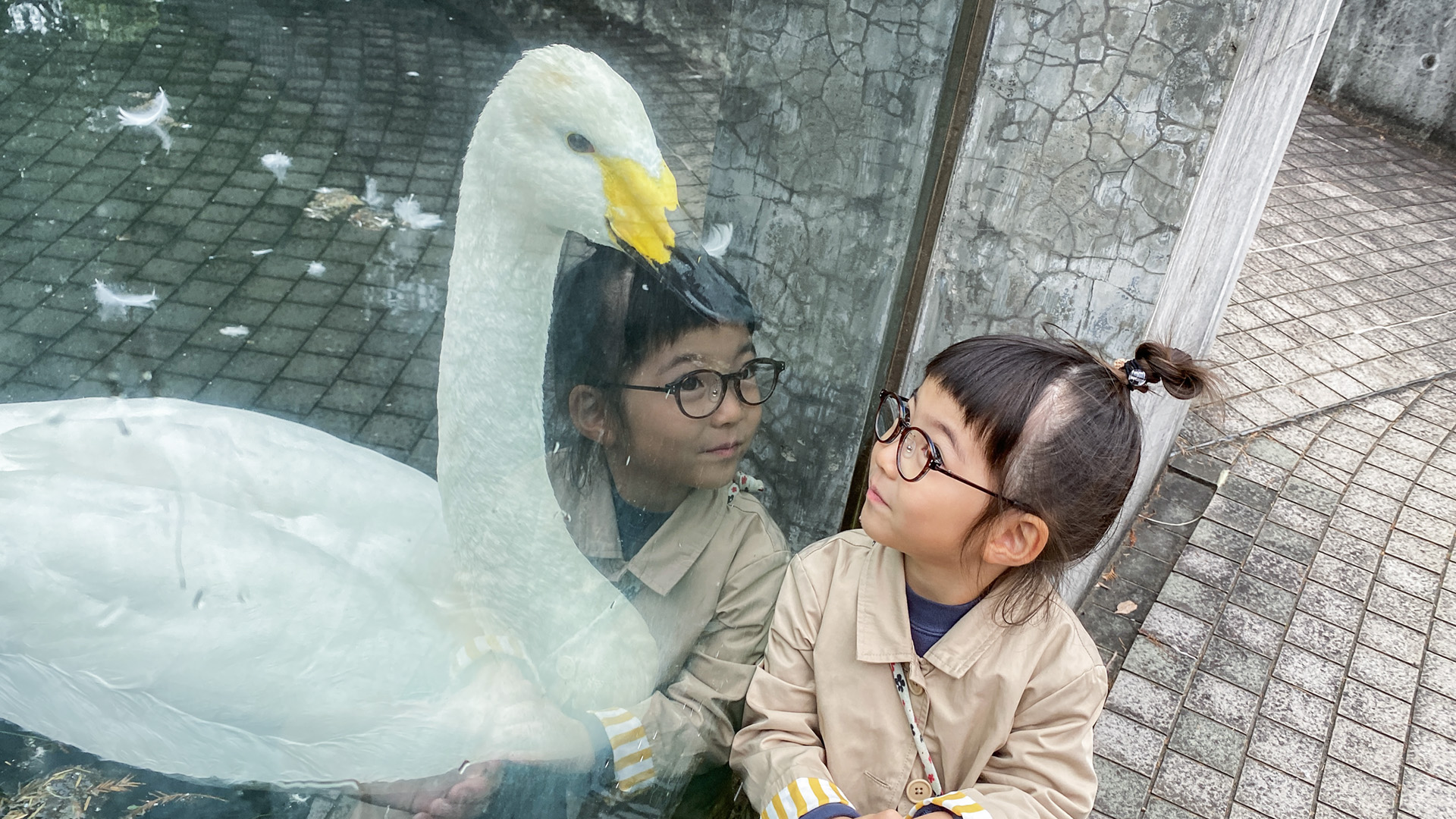 白鳥がいる池のほとりで、ガラスをコンコンとノックしてみたら