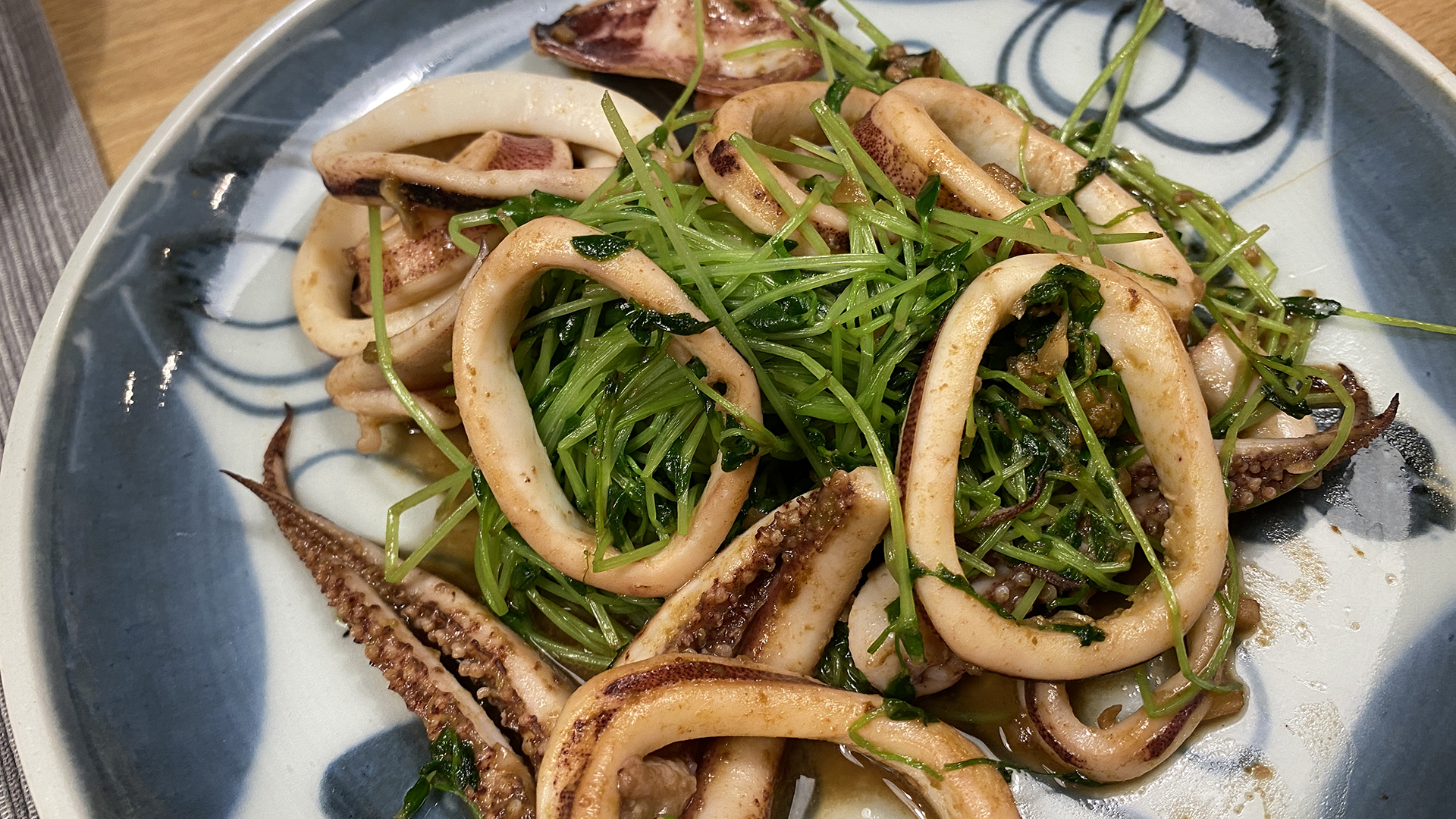 豆苗とイカ炒め。