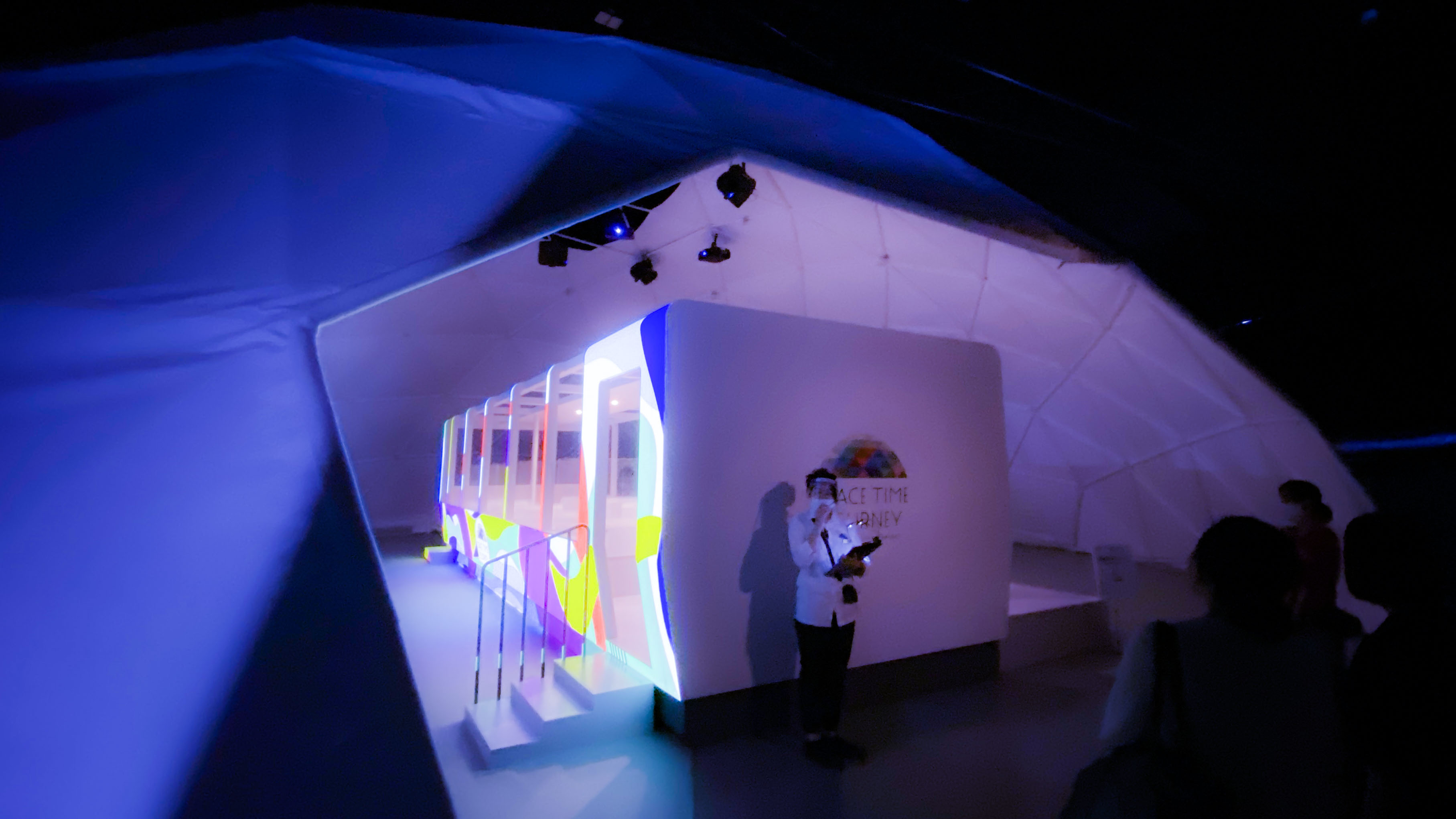 ホワイトロックと呼ばれる 白い半球ドームに360度映像が投影され 現在の高輪ゲートウェイ駅を出発し 北斎の浮世絵やゴッホらの西洋絵画、 東京の地形などをモチーフにした没入感がある空間で、時空を超えた感動体験する ライドシアターです。