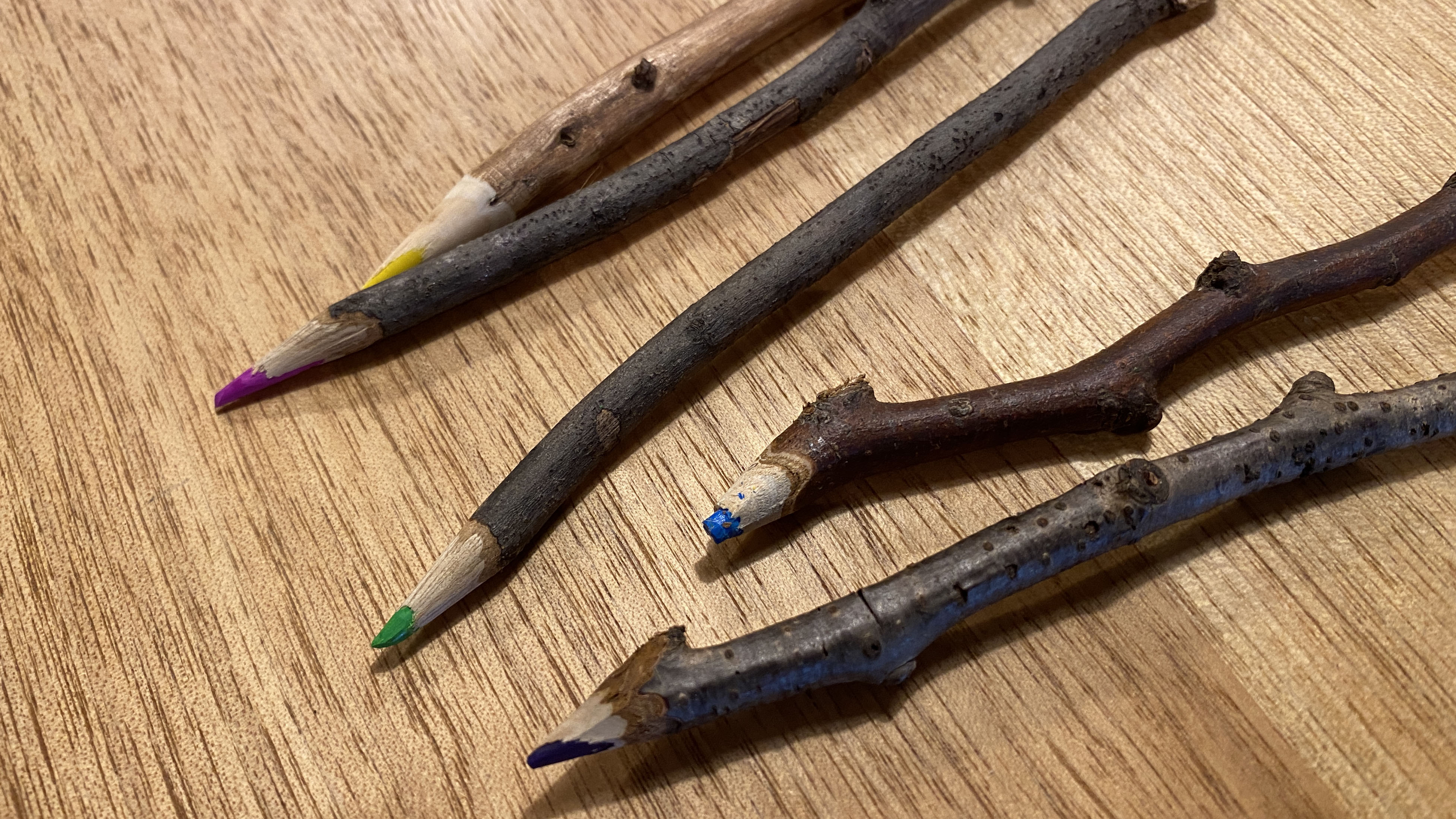 鉛筆削りで削ったら なかなかしゃれた 小枝の色鉛筆完成。