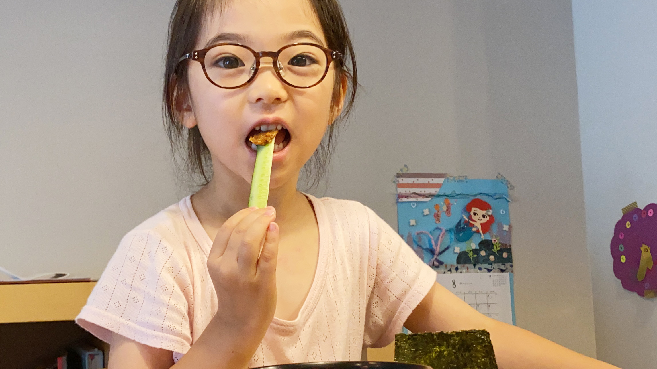 きゅうりに 味噌をつけています。