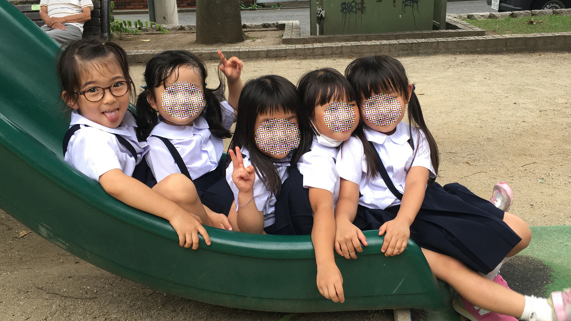 幼稚園の仲良しと すべりだいをぎゅうぎゅう。