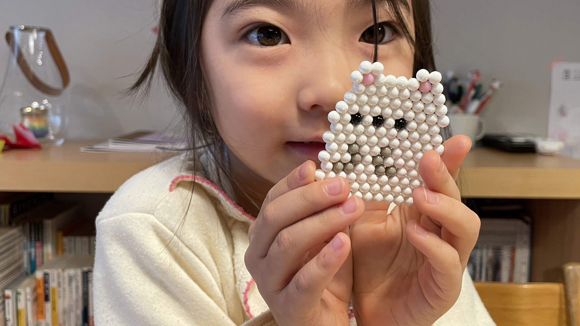 で、自分のBB弾コレクションも あるとき、アクリル看板屋さんが注射器型のアクリル接着剤をおしえてくれて BB弾を並べてあとに 一滴一滴くっつけるという遊びをやっていた。 それが面白かったことを 完全に再現してくれていて アクアビーズ面白い!ってなっている。