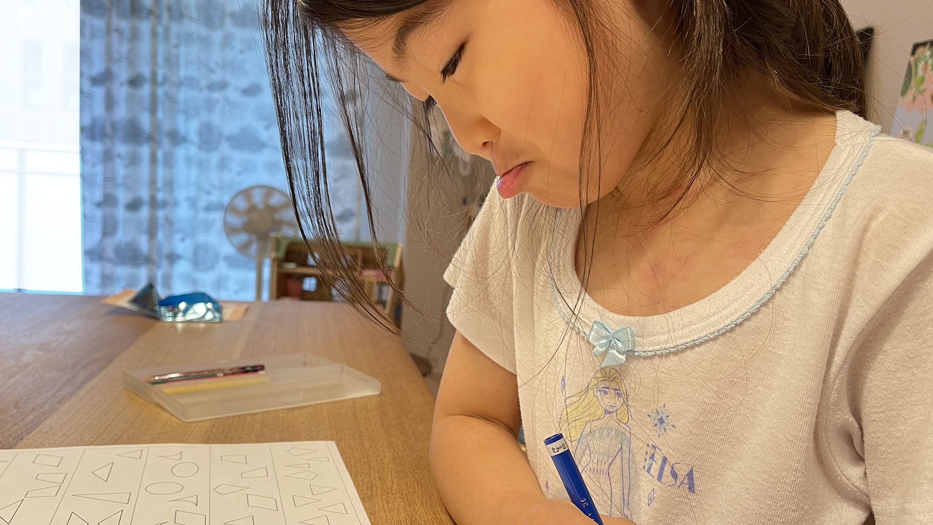 パズルができずに ぶーたれた顔です。 だいたい図形のペーパーはこんな顔してる。。