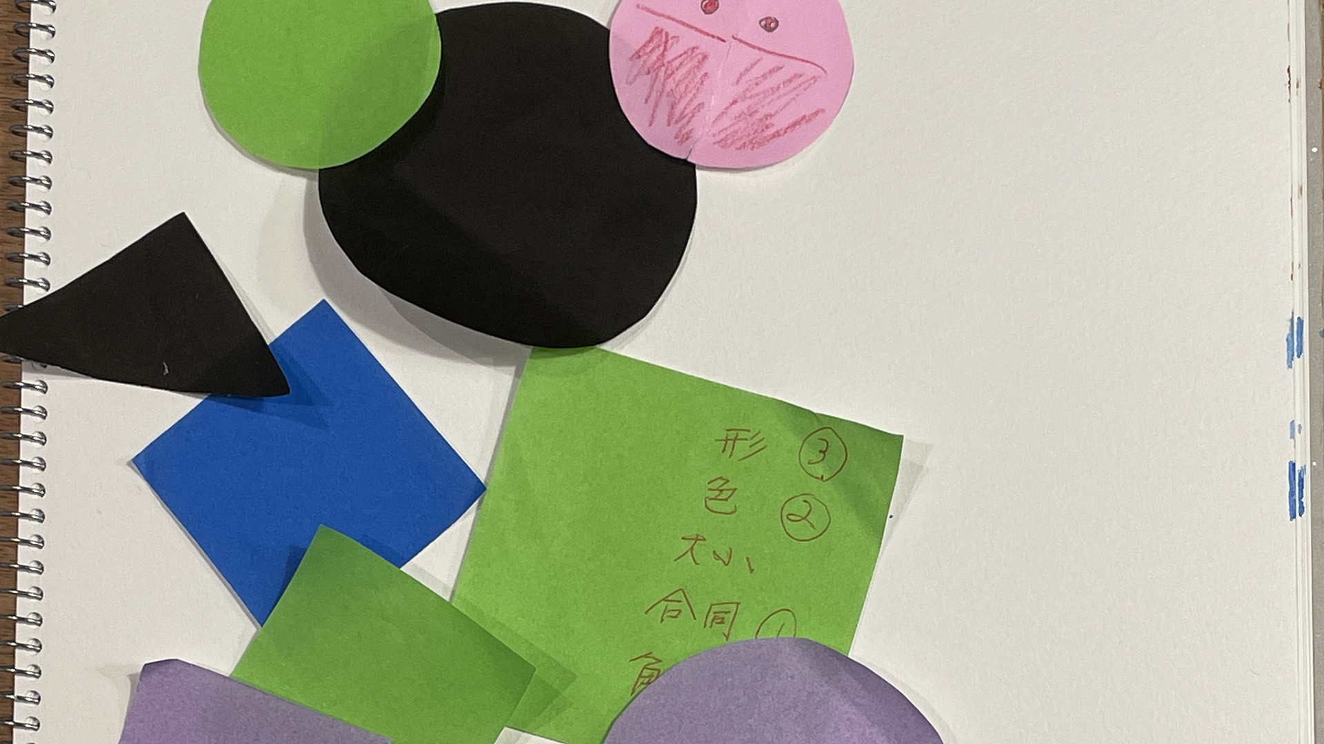 かたち いろ 大小 なんて チェックポイントをいわれながら 折り紙の組み合わせで 何かにする課題。