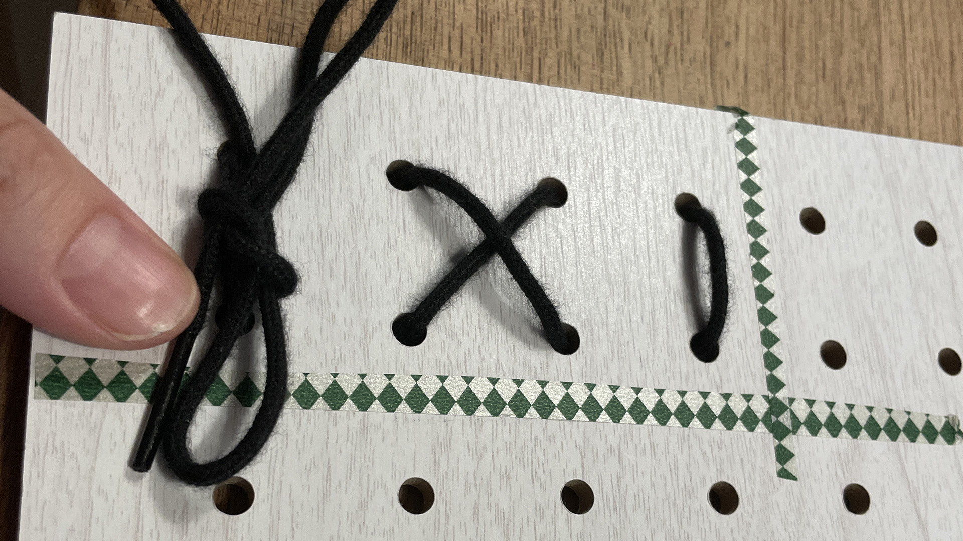 紐通しの板がデコレートされている。