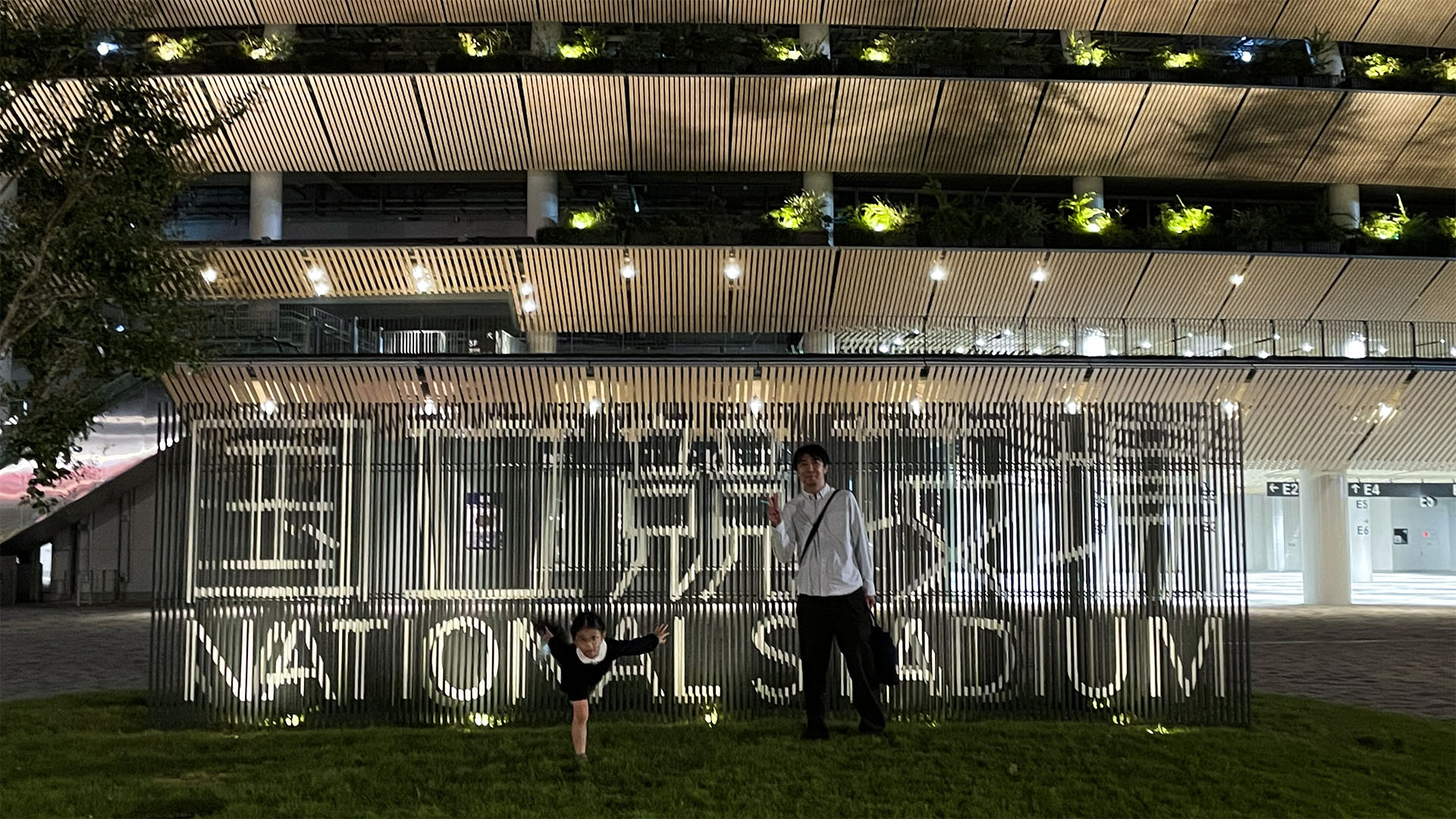 ロゴの前の芝ではしゃぐ。