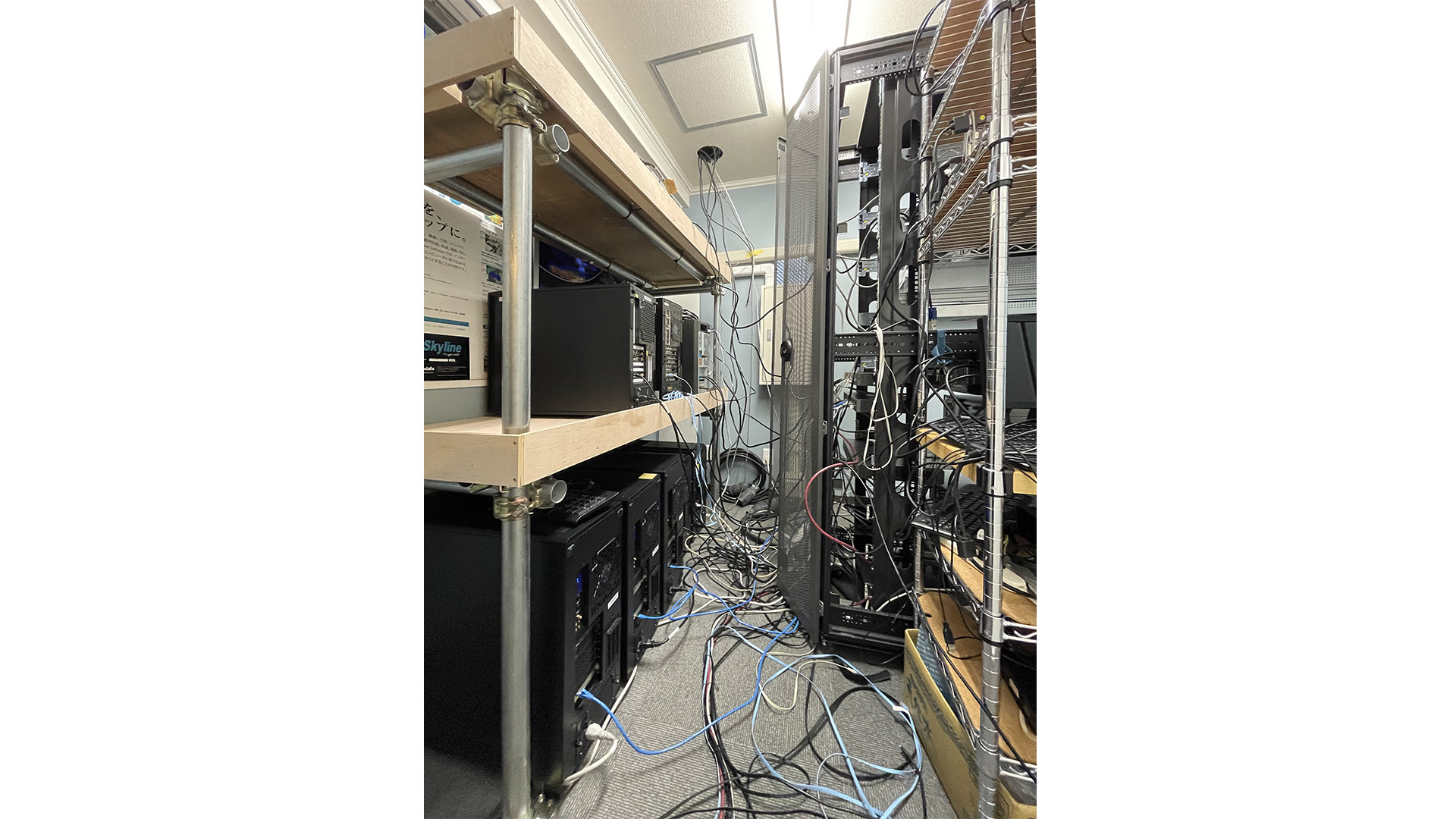 社内のサーバールームを単管足場のパイプで ラック作成してもらい