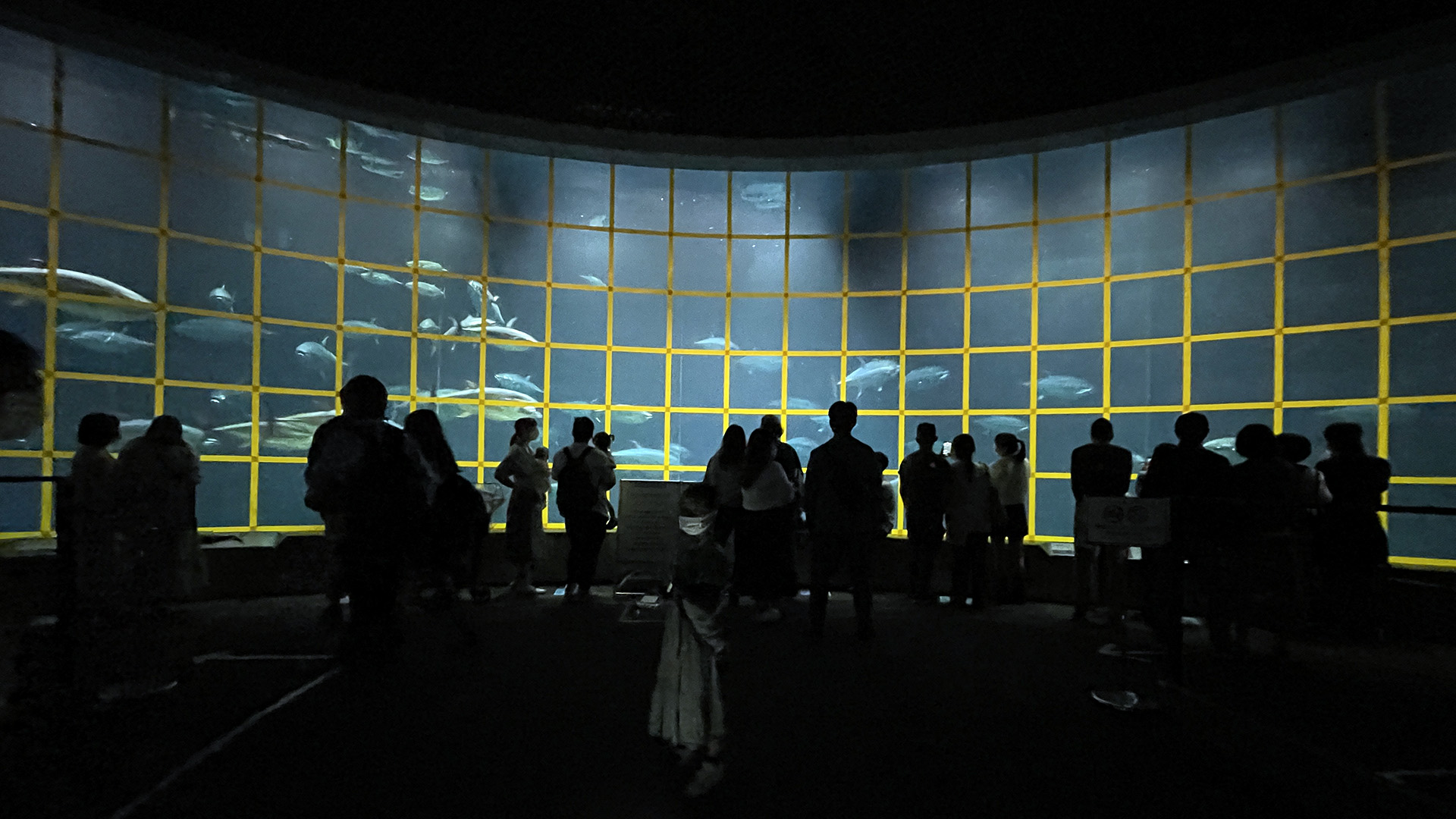 おい! 聞いてたマグロのパノラマ水槽と違うぞー。 黄色いテープがグリッド状にはられている。 これは 衝突回避のためらしく、以前、全滅に近い大量死をしたんですよね。 太平洋クロマグロは絶滅危惧種II類に指定されており、再投入を反対している声もあるようで 水族館の運営は都立であっても民間であっても難しい判断があるんだろう。