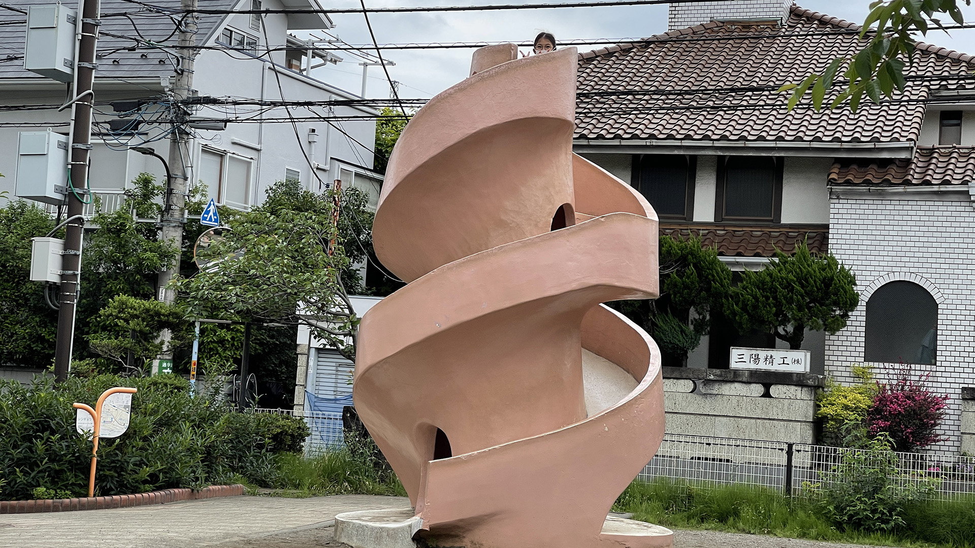 そしてクレープキッチンカーに行った我々を待ち構えていたのは 売り切れの4文字 悲しい思いのまま 阿部さんにもう一つ紹介してもらった ソフトクリーム滑り台。 なんと二重らせんになっていて サザエ堂のような構造の珍しい滑り台。