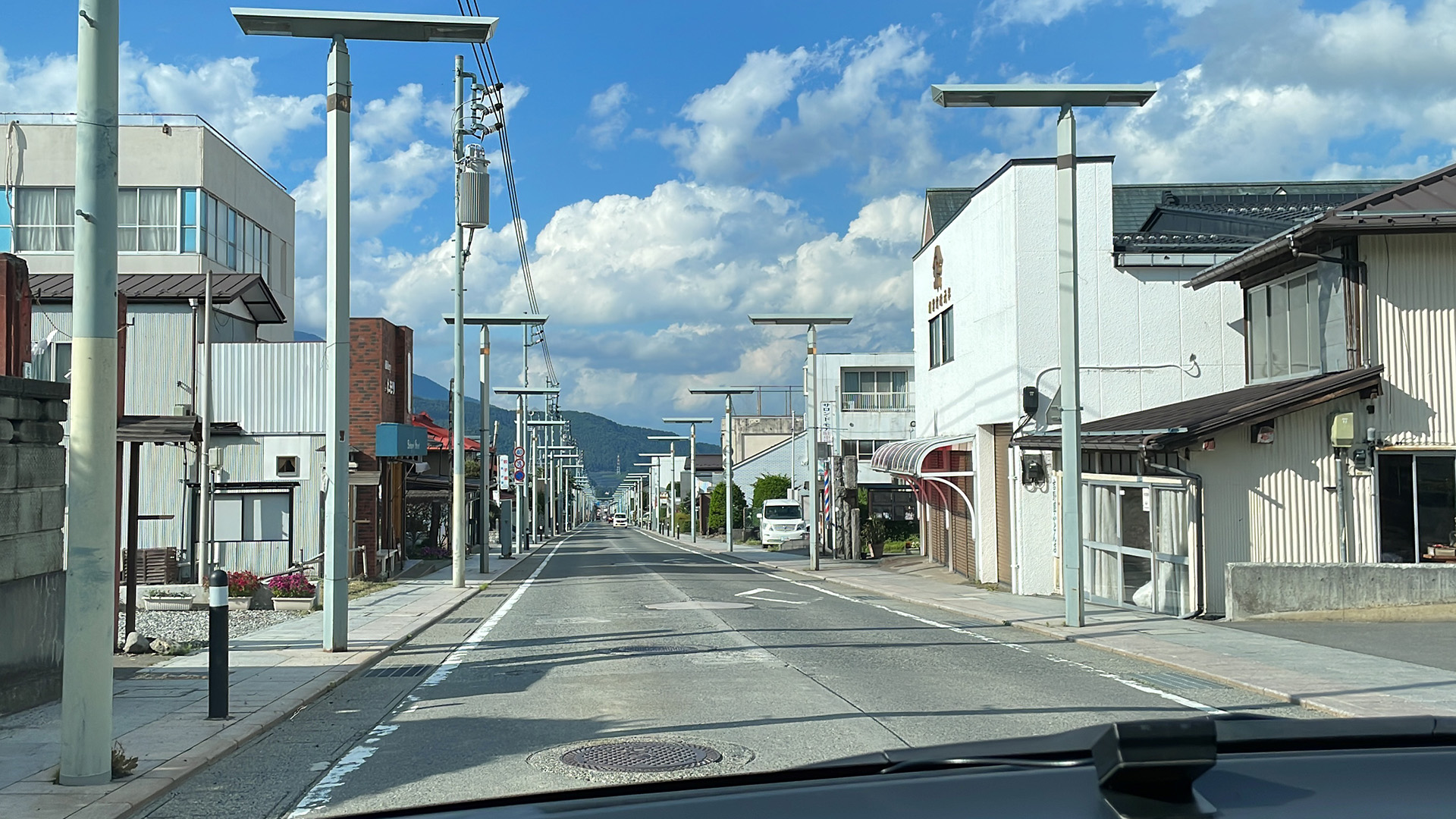 なんだか照明がおもしろいし、一直線の道路。