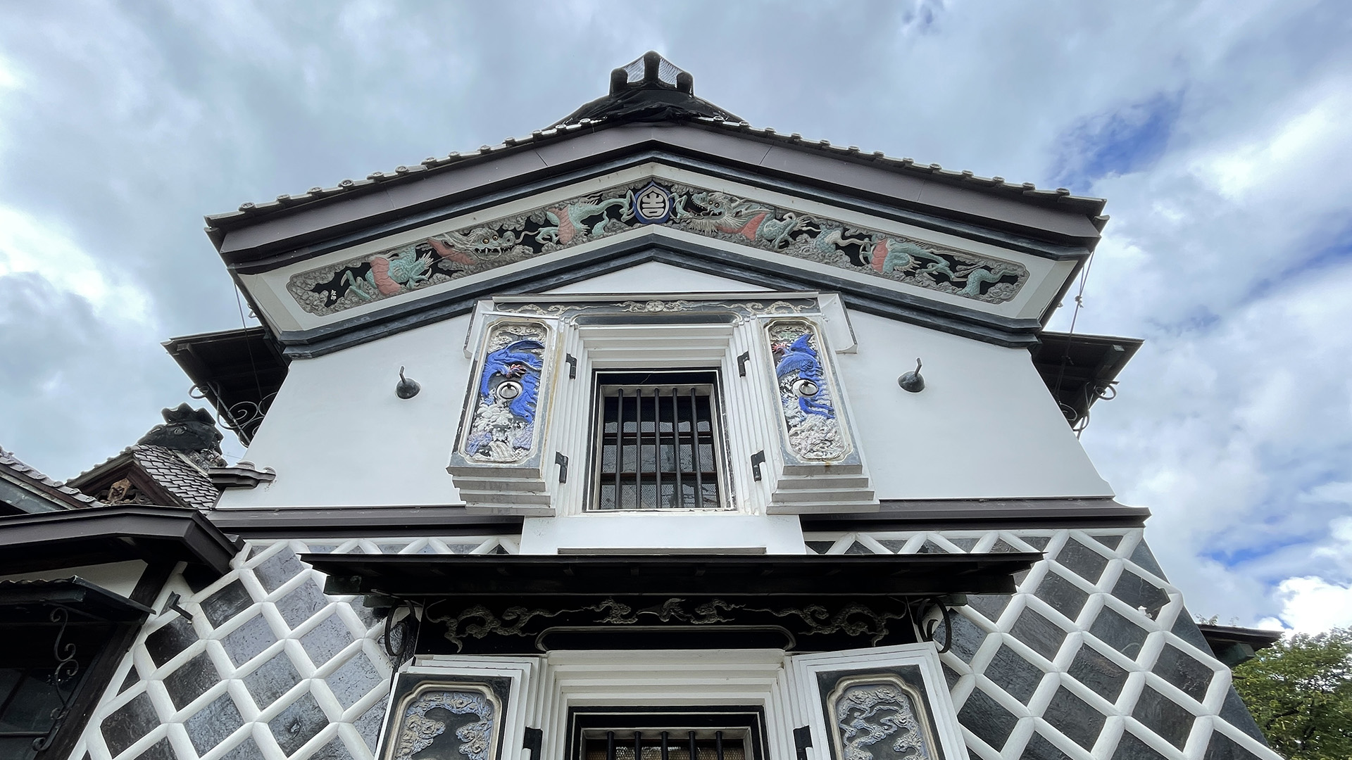 蔵の装飾に鏝(こて)で設えたアートの数々。