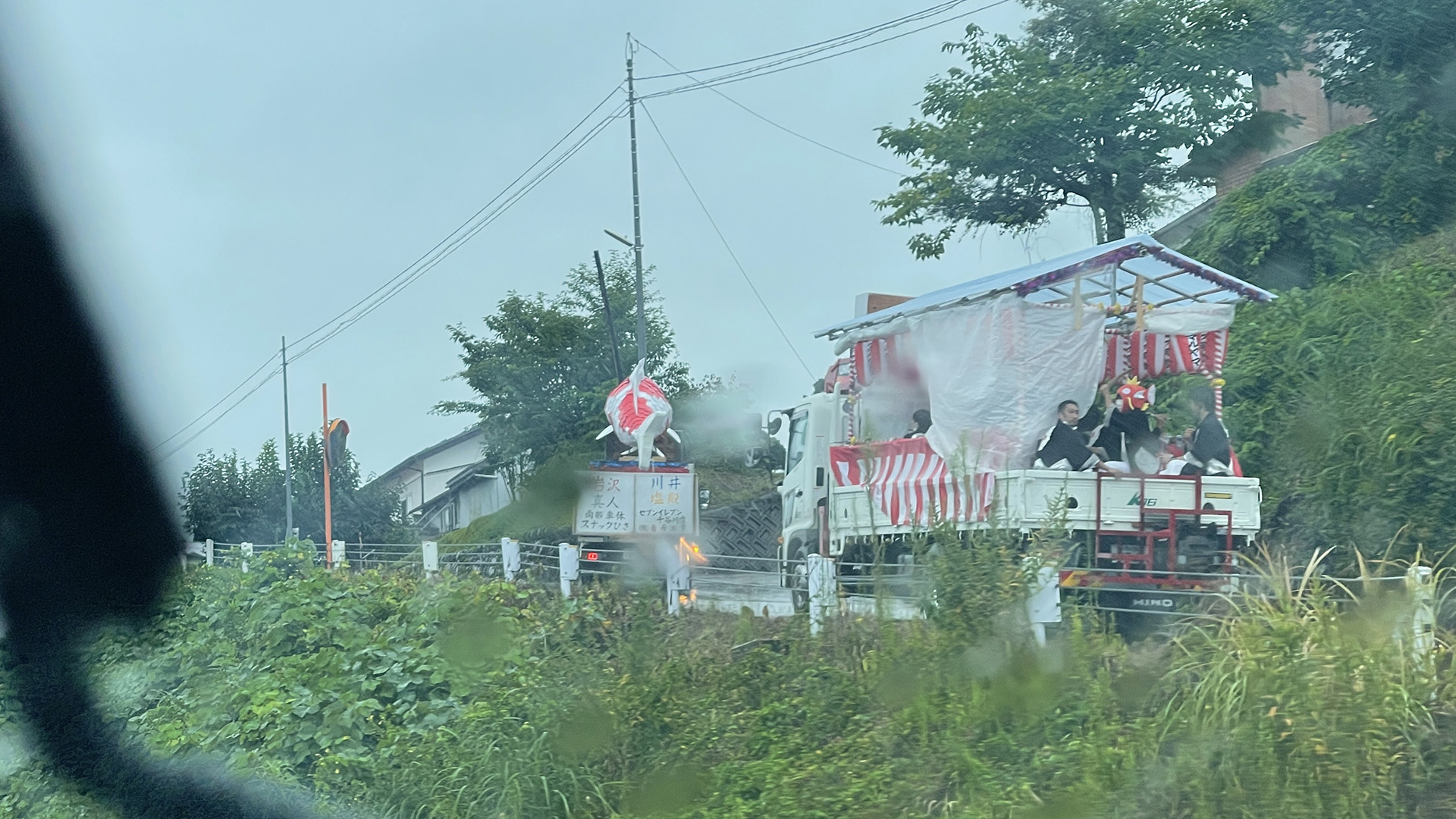 途中、小千谷祭りのマンドウに出会いました。 トラックの上の屋台です。