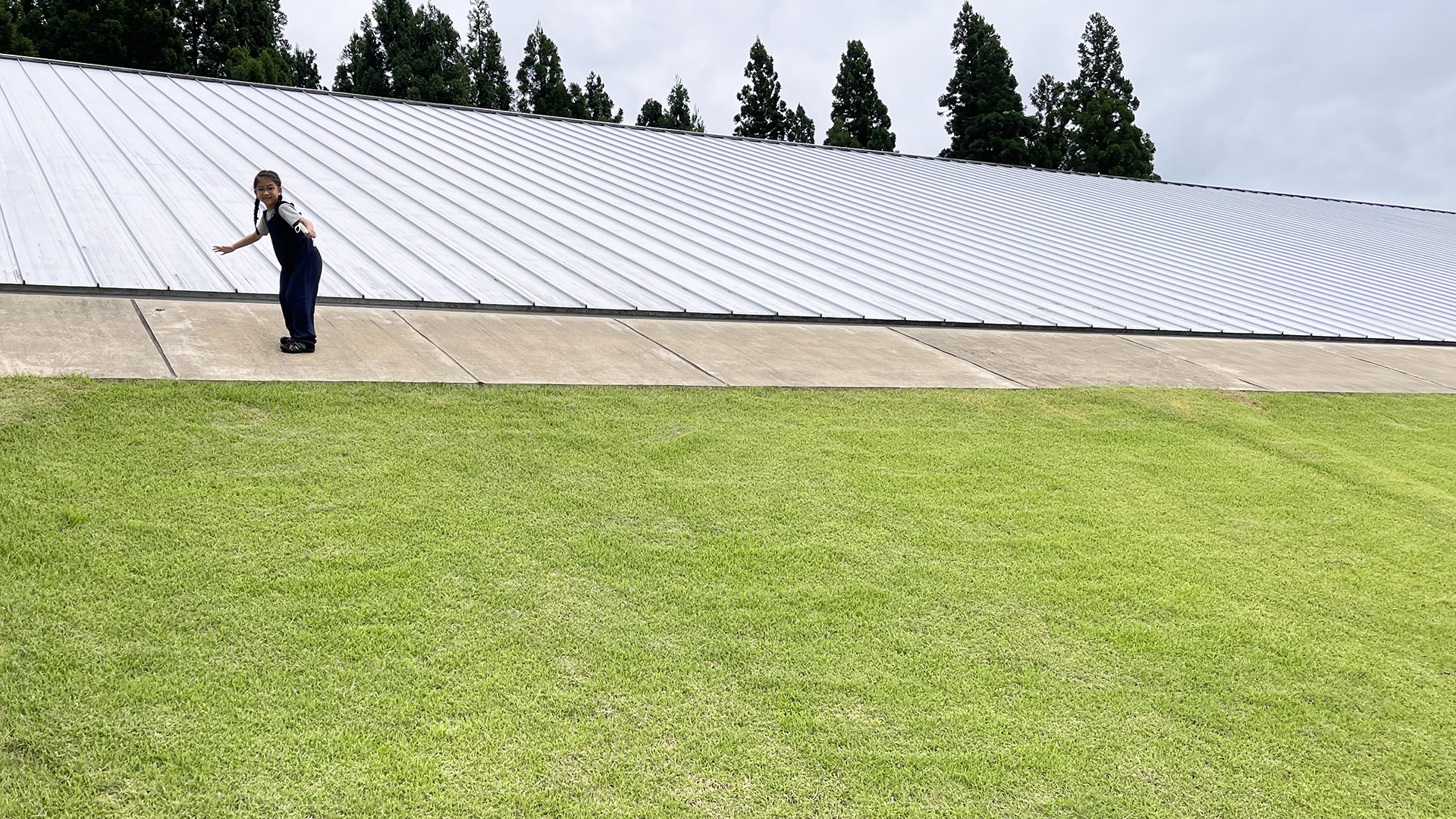 屋根と芝が斜面でつながる。 冬はそりで楽しめるのか?