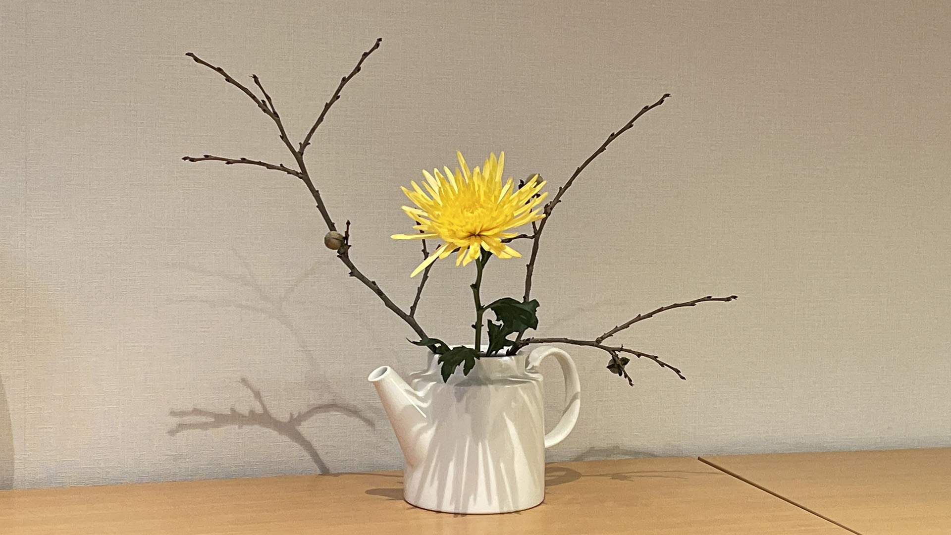 近所で見つけた柿の実を 生け花展示をやっているところに持ち込んで聞いてみたら 琉球柿とのこと。 ちょっと真似して生けてみた。花瓶が無いからPOTだけど。。 菊はアドバイスをくれたおば様からのプレゼント。